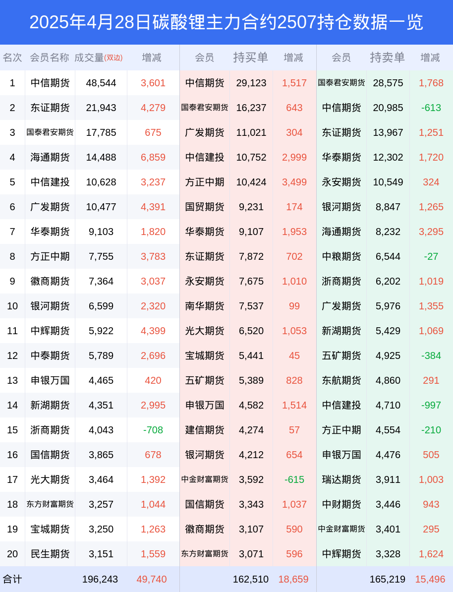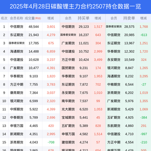 新浪期货 根据交易所数据,截至4月28日收盘主力合约碳酸锂2507,涨跌-2.11%,成交量14.57万手,持仓数据显示前20席位呈现净空,差额头寸为2709手。