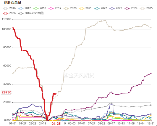 注册仓单增加。4月25日仓单量为29750,较上周增40张。