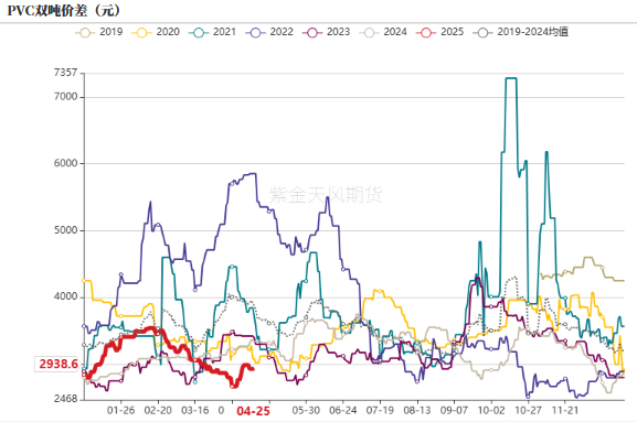利润:中性偏多 单PVC利润低位,综合利润分化。电石一体化吨利-1022元,山东外购电石法吨利-1043元;华北乙烯法利润529元/吨。西北综合利润390元/吨,华北综合利润-333元/吨,双吨价差2939元。