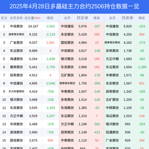 新浪期货 根据交易所数据,截至4月28日收盘主力合约多晶硅2506,涨跌-3.05%,成交量8.09万手,持仓数据显示前20席位呈现净多,差额头寸为8377手。