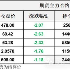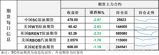 【1】WTI主力原油期货收跌1.63美元,跌幅2.63%,报60.42美元/桶;布伦特主力原油期货收跌1.51美元,跌幅2.33%,报63.28美元/桶;INE原油期货收跌2.07%,报478元。