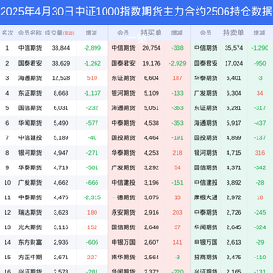 新浪期货 根据交易所数据,截至4月30日收盘主力合约中证1000指数期货2506,涨跌+0.56%,成交量10.88万手,持仓数据显示前20席位呈现净空,差额头寸为17179手。