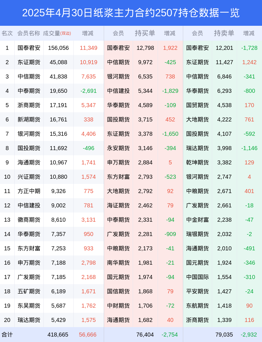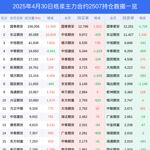 新浪期货 根据交易所数据,截至4月30日收盘主力合约纸浆2507,涨跌-2.51%,成交量27.75万手,持仓数据显示前20席位呈现净空,差额头寸为2631手。