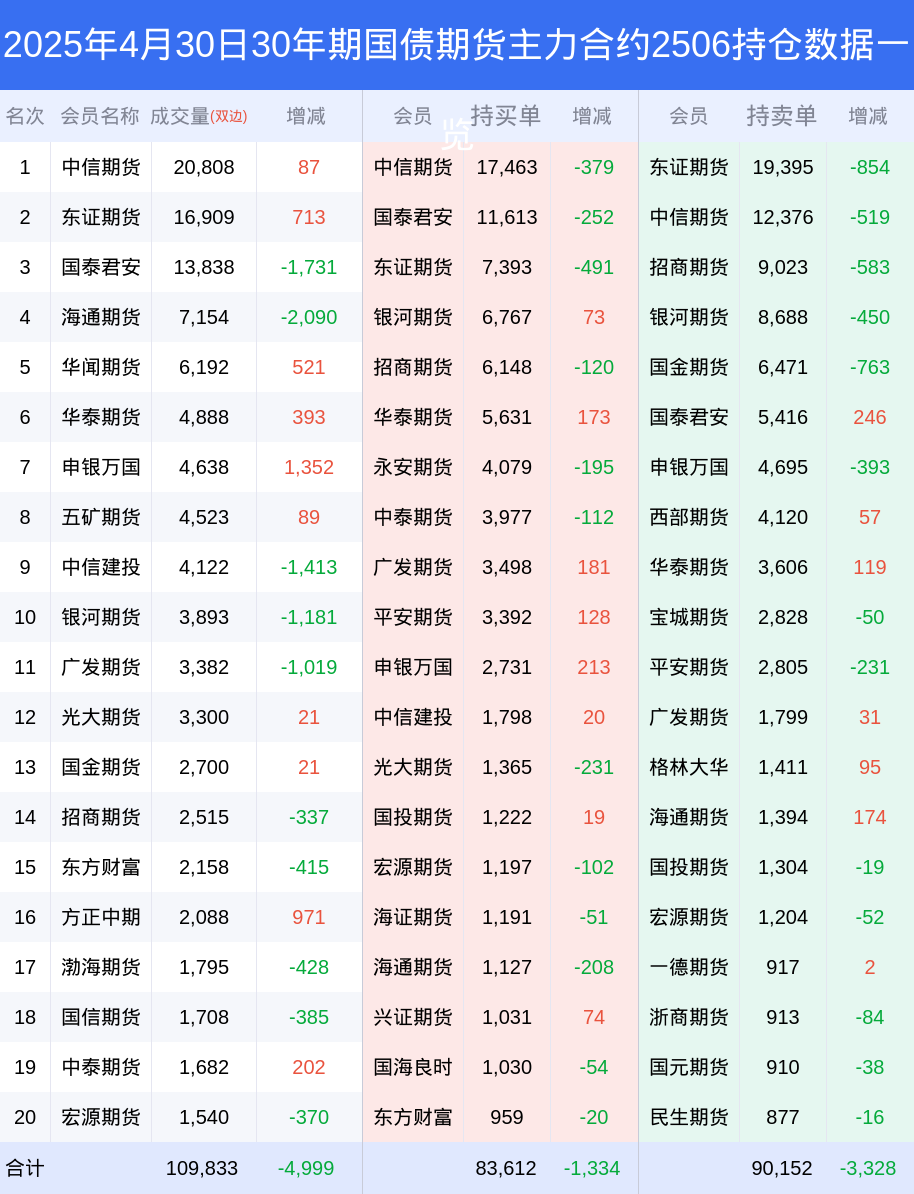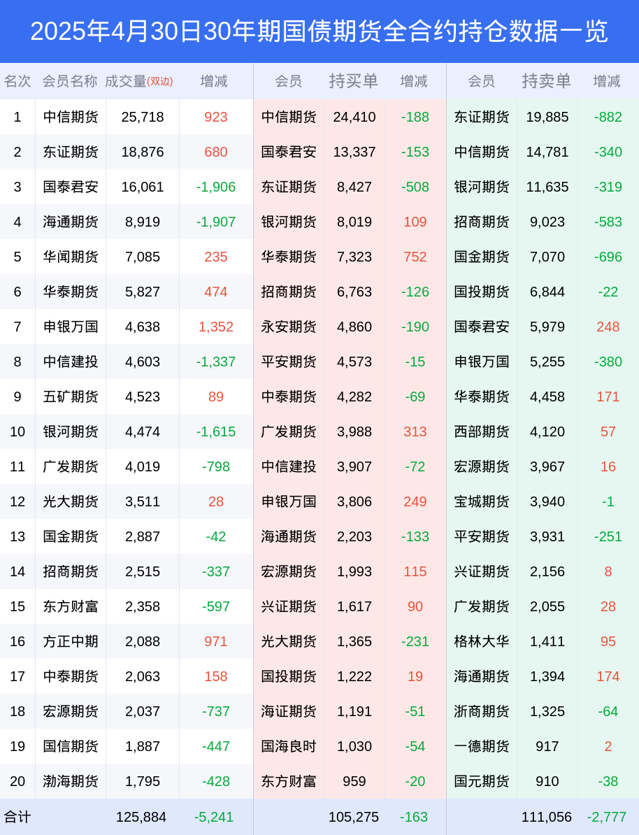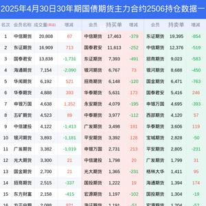 新浪期货 根据交易所数据,截至4月30日收盘主力合约30年期国债期货2506,涨跌-0.12%,成交量7.19万手,持仓数据显示前20席位呈现净空,差额头寸为6540手。