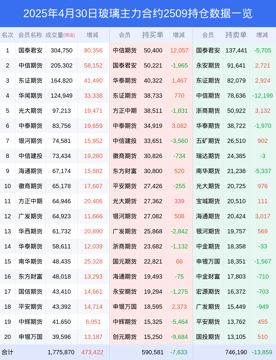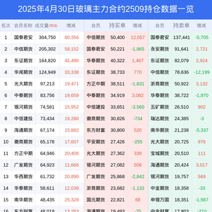 新浪期货 根据交易所数据,截至4月30日收盘主力合约玻璃2509,涨跌-2.96%,成交量145.69万手,持仓数据显示前20席位呈现净空,差额头寸为155609手。