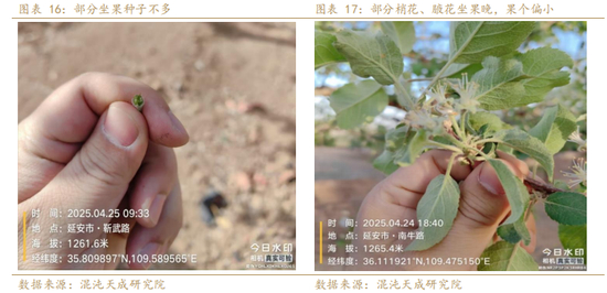 前期市场调研今年花量大,普遍预期产量没问题,即便减一点也没事,这和2018年以后每次霜冻造成减产后大多最后有所修复有关,而今年是坐果出现问题,也是历史上为数不多的大面积坐果期出现的减产,与倒春寒影响不同,坐果产生的产量受损不可逆。今年主要是受到罕见的热干风影响,授粉受精受阻,前期在果园里看到花团锦簇,但果柄迟迟不打弯,同一片园子,果农在4月21日预期没问题(预估能套14万袋),到4月25日好像有点问题(预估能套10万袋),再到4月28日出了大问题(预估最多8万袋),前后也就一周左右的时间,这样的例子不胜枚举,调研也呈现出一圈比一圈看着更差的特征。