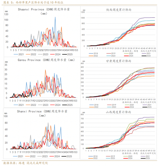 2025年三四月份,一场罕见的大面积干旱席卷中国大地,广西、陕西、河南、安徽等11个省,遭遇了自1961年以来最严峻的气象干旱。苹果西部主产区,陕西、甘肃、山西均受到影响,降雨量均较低,累计降雨是近10年来最低水平(数据只看到了10年)。