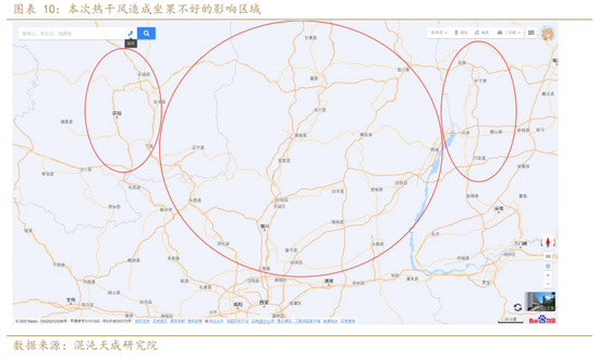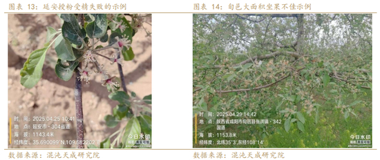 1、 大概80%的果农反馈减产由于热干风的原因,通过走访调研,本次花期遭遇热干风和减产之间存在强相关关系,如图所示,陕西大部分区域(北边至富县宜川,南边至三原,整体减产幅度约50%),山西(吉县,相较于前年减产50%,比去年的减产幅度大20%),甘肃(庆阳,减产幅度约30%-40%)均在热干风期间开花,减产幅度较大;热干风前和干热风后开花的区域受影响明显小,比如乾县、临猗以及万荣南部在热干风之前开花授粉坐果,受影响较小,甘肃静宁庄浪以及其他高海拔区域在热干风之后开花,受影响也相对较小。