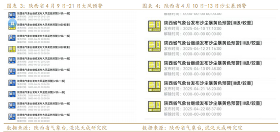 根据前期预估,西部产区中陕西大部分区域,山西吉县、甘肃产区的花期均在4月10日至20日期间,陕西宝鸡和山西运城花期在4月7日前后。根据陕西省气象台数据,4月9日至21日均有大风蓝色至橙色预警,4月10-13日发布沙尘暴黄色预警,与产区花期刚好重合。