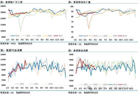 从EIA周度数据来看,近几周美国汽油消费表现明显好于去年,这让汽油表现明显强于原油,带动了炼油毛利的反弹。而中国市场原油加工量持续低于去年同期,尤其是柴油消费较去年同期有大幅下滑,新能源销售维持高增长,对成品油消费仍形成了明显的替代。