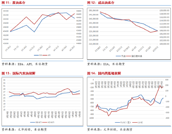 裂解价差表现方面,4月份中北美汽柴油裂解价差在后半程时间略有回暖,但可以明显看到汽油裂解表现得以延续至5月初,但柴油裂解则出现了明显的下滑,这主要是由于北美汽油库存的下降对汽油价格形成了有效支撑;而传递至内盘视角下,内盘低硫裂解表现在4月底明显回暖,涨幅明显高于高硫,这在一定程度上是受到了柴油价格表现的影响,因此后续LU裂解或存在一定的回调可能,建议可谨慎偏空布局,仅供参考。