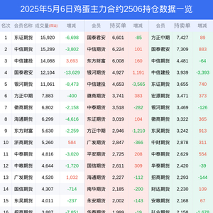 新浪期货 根据交易所数据,截至5月06日收盘主力合约鸡蛋2506,涨跌-2.30%,成交量11.06万手,持仓数据显示前20席位呈现净多,差额头寸为489手。
