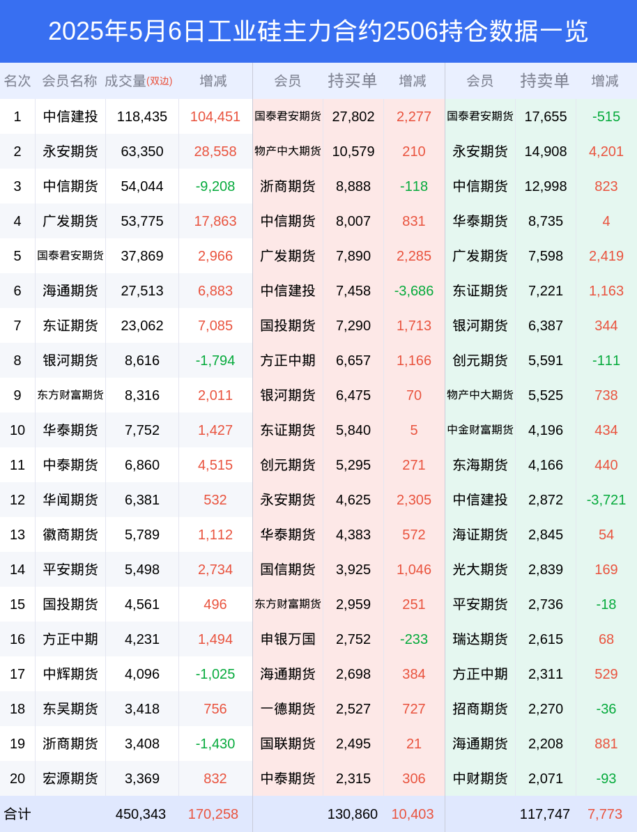 新浪期货 根据交易所数据,截至5月06日收盘主力合约工业硅2506,涨跌-2.57%,成交量26.95万手,持仓数据显示前20席位呈现净多,差额头寸为13113手。