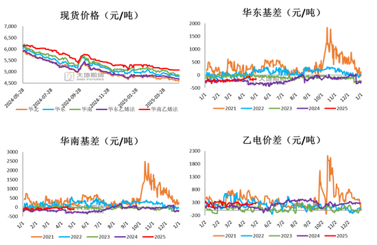 现货价格、基差及乙烯法-电石法价差