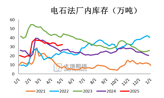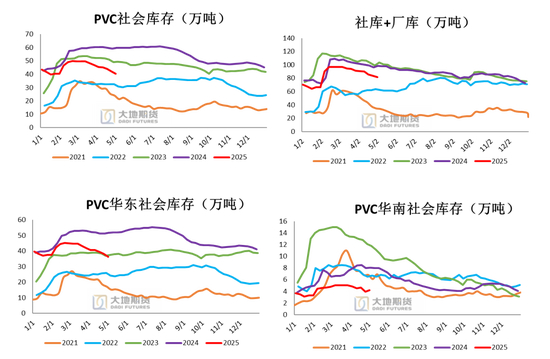截至5月2日PVC社会库存(老样本)环比减少4.02%至40.36万吨,同比减少15.57%;其中华东地区在36.18万吨环比减少5.10%,同比减少29.86%;华南地区在4.18万吨,环比增加6.10%,同比减少48.20%。