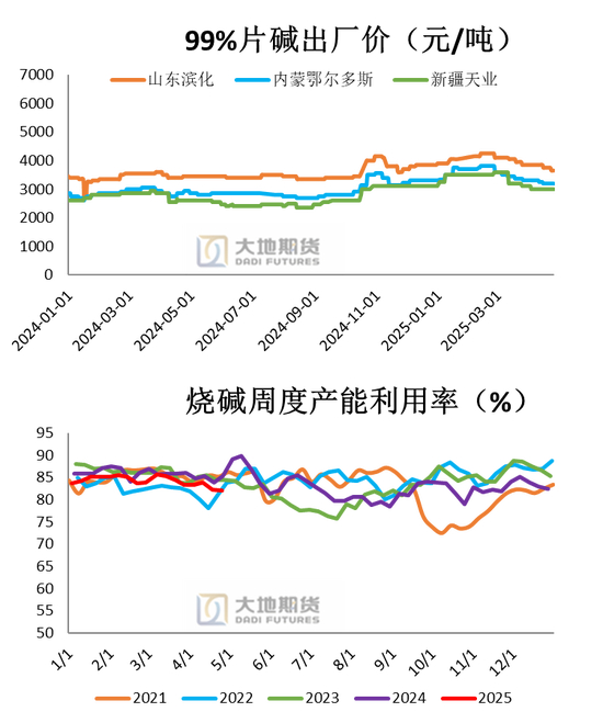 上周(20250425-0430)中国20万吨及以上烧碱样本企业产能平均利用率为83.9%,较上周环比+1.8%。西北、华中、华东、华南、西南新增重启装置,带动负荷不同程度提升,周内华北有装置减产导致负荷下滑。山东产能利用率呈现上升+0.1%至91.1%;