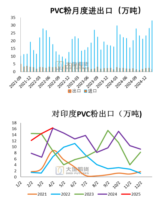 2025年国内1-3月PVC粉出口印度累计42.8万吨30.7,累计同比增加39.4%;