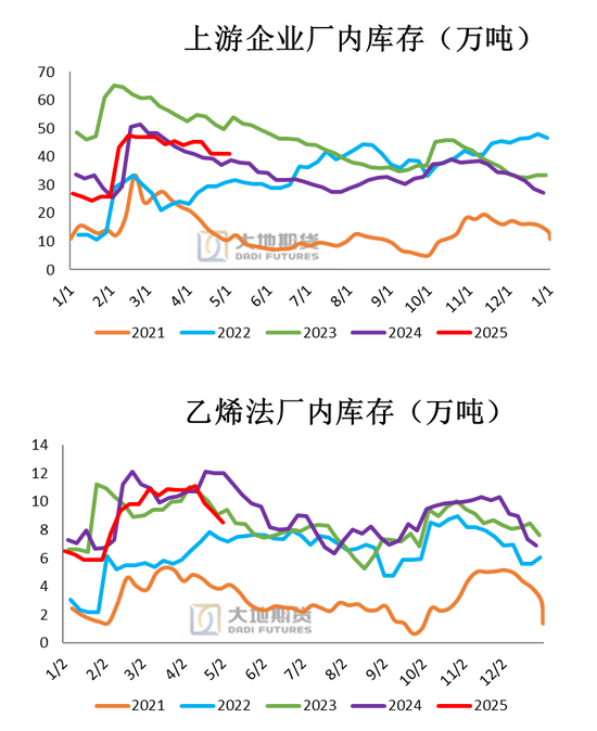 上游厂库小幅累库,出口订单持续交付及开工率回升,其中电石法小幅累库,乙烯法小幅去库。