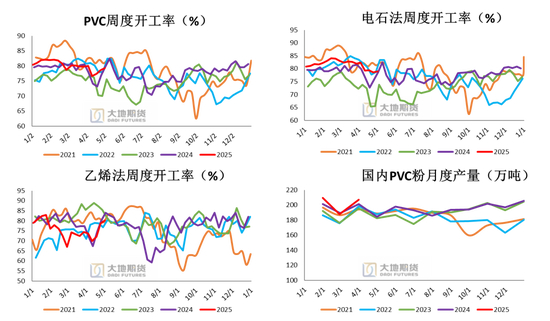 2025年3月,中国PVC表观消费量在172.32万吨,环比2月增加15.9万吨,1-3月累计512.5万吨,同比减少4.29%。国内PVC生产企业产量维持高位,同比去年同期微增,对外出口量同比大幅增长,表观需求量偏弱。