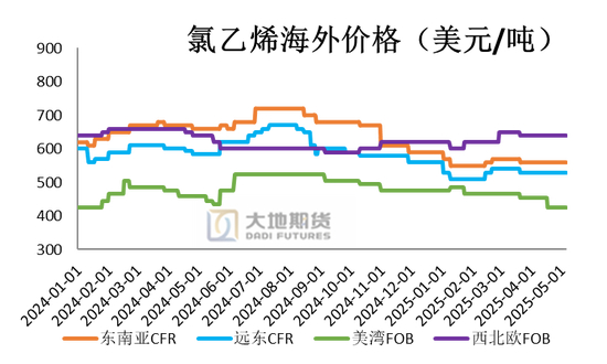 中国台湾地区出台5月报价,价格不动,CIF印度在700美元/吨,CFR中国大陆主港在700美元/吨,国内电石法出口价在598~610美元/吨附近,国内优势仍在,印度宣布BIS延期至2025年6月24日。