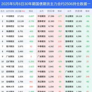 新浪期货 根据交易所数据,截至5月06日收盘主力合约30年期国债期货2506,涨跌+0.11%,成交量6.17万手,持仓数据显示前20席位呈现净空,差额头寸为7379手。