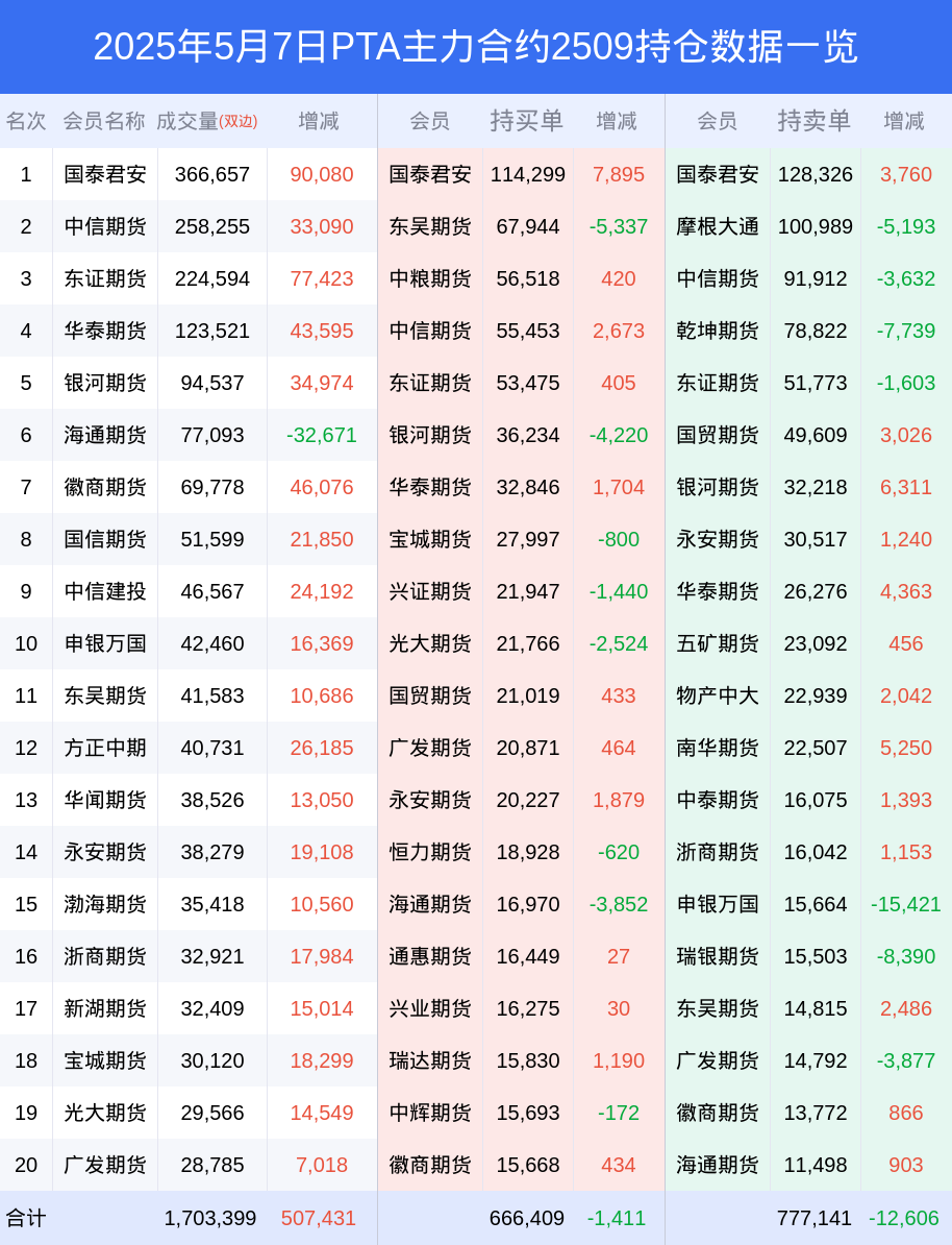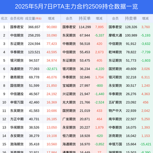 新浪期货 根据交易所数据,截至5月07日收盘主力合约PTA2509,涨跌+2.48%,成交量129.80万手,持仓数据显示前20席位呈现净空,差额头寸为110732手。