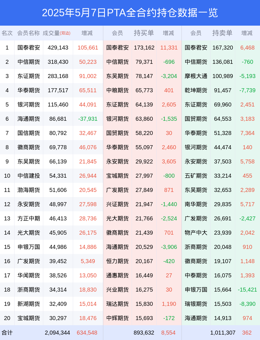 PTA期货全合约总计成交161.11万手,比上一日新增54.11万手。全合约前20席位多头持仓98.68万手,比上一日增加1.97万手。全合约前20席位空头持仓111.74万手,比上一日增加8310手。