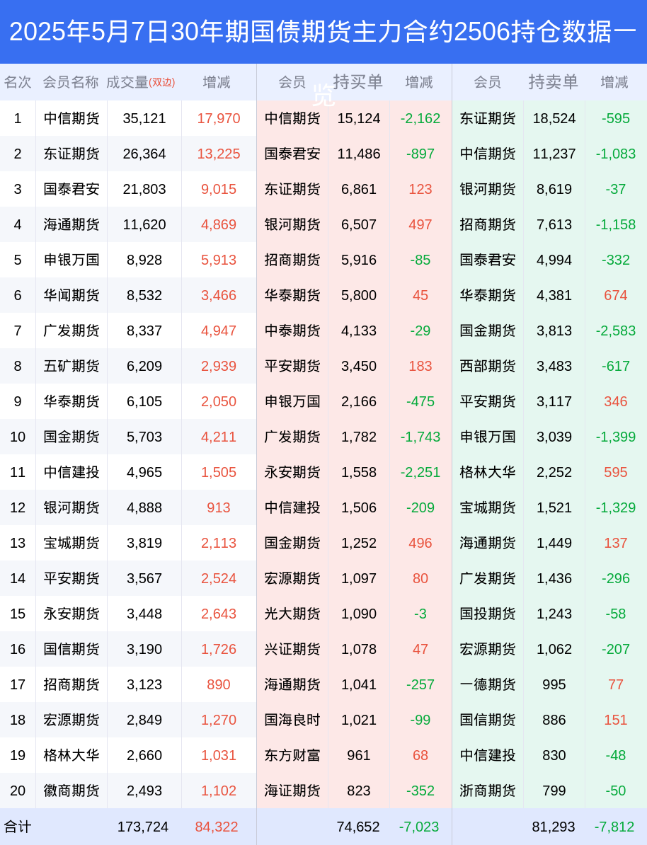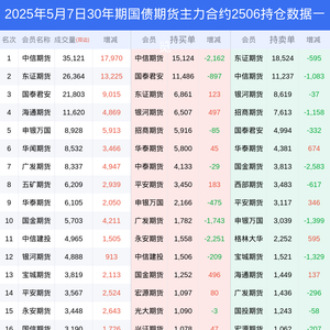 新浪期货 根据交易所数据,截至5月07日收盘主力合约30年期国债期货2506,涨跌-0.62%,成交量11.57万手,持仓数据显示前20席位呈现净空,差额头寸为6641手。