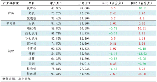 钢材上下游产业链开工负荷变化:原料开工偏强 成材开工涨跌不一