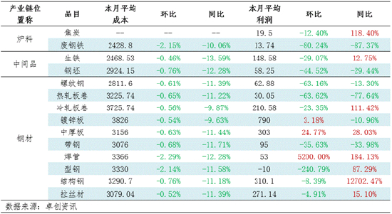 钢铁产业链毛利润变化对比:成本齐跌 利润表现不一