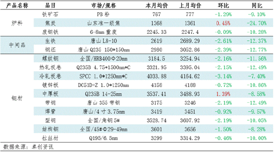 表1 钢铁产业链各产品月均价运行情况(单位:元/吨)