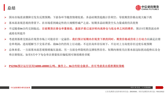 操作策略:4月下旬开始我们在行业内领先提示关注PS2506潜在修复动能,目前仍坚定前期观点,预计PS2506运行区间34000-40000元/吨;操作上,06合约轻仓做多,亦可考虑卖出看跌期权策略