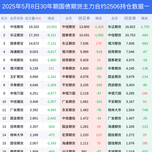 新浪期货 根据交易所数据,截至5月08日收盘主力合约30年期国债期货2506,涨跌+0.26%,成交量7.15万手,持仓数据显示前20席位呈现净空,差额头寸为6139手。