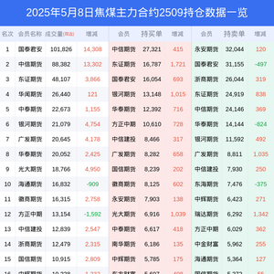 新浪期货 根据交易所数据,截至5月08日收盘主力合约焦煤2509,涨跌-2.13%,成交量39.09万手,持仓数据显示前20席位呈现净空,差额头寸为54146手。