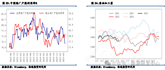 近期国内原油加工量基本平稳,主营炼厂产能利用率持续下滑,当前为71.93%,较前一期下降0.4个百分点,低于历史同期平均水平75.99%;独立炼厂产能利用率则缓慢上升,当前为60.93%,较前一期增加0.77个百分点,接近历史同期平均水平59.14%。汽油需求疲软,价格承压下行,而柴油需求相对稳定,价格表现抗跌。整体来看,国内成品油市场供需偏弱,炼厂开工率分化,原油加工量维持低位,短期内市场仍面临压力。