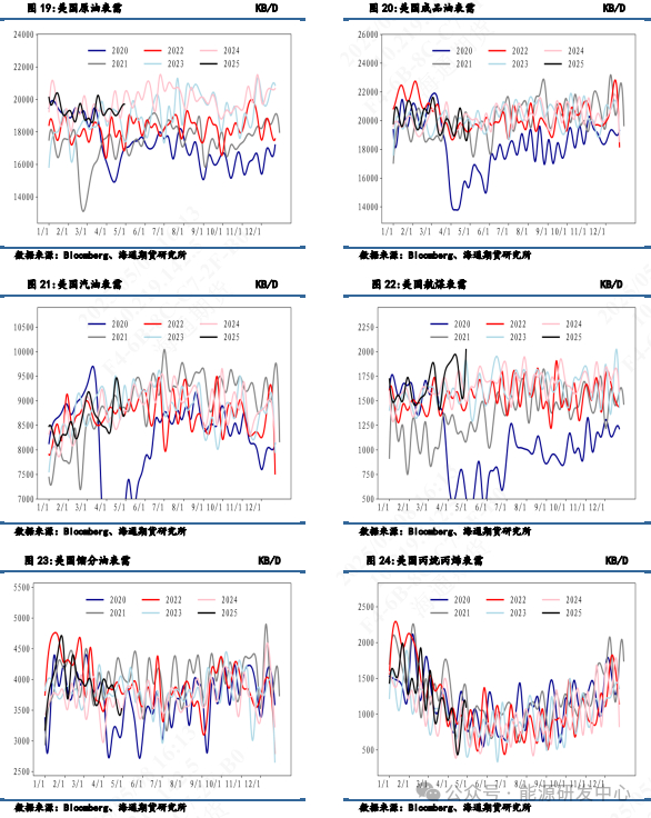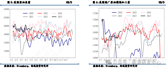 需求方面,美国原油表需有小幅上行,超历史同期平均水平。同时,炼厂角度的加工量环比基本持平,后期仍有上行趋势,整体表需边际有小幅好转。