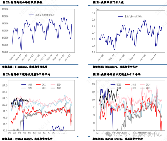 高速公路行驶里程数季节性增强,但美国卡车运输活动再次低于2024年水平,显示出近期交通活动的强劲复苏趋势,但季节性增长已略有停滞。TSA乘机人数基本平稳,空中交通量持续回落。