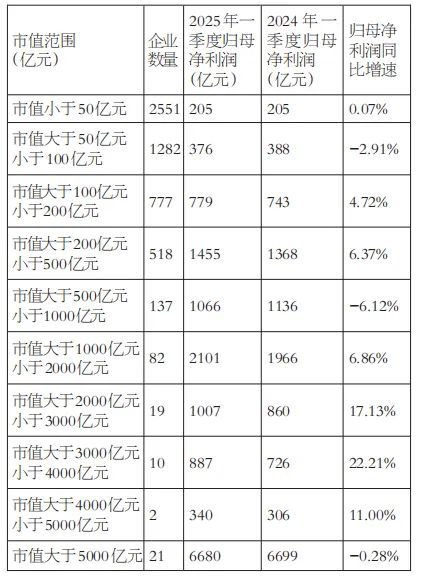 2025年一季度共有5399家上市公司披露了业绩,整体同比增速为3.37%,业绩增速大于零的比例为54.72%。