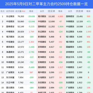 新浪期货 根据交易所数据,截至5月09日收盘主力合约对二甲苯2509,涨跌+2.28%,成交量24.87万手,持仓数据显示前20席位呈现净空,差额头寸为6342手。