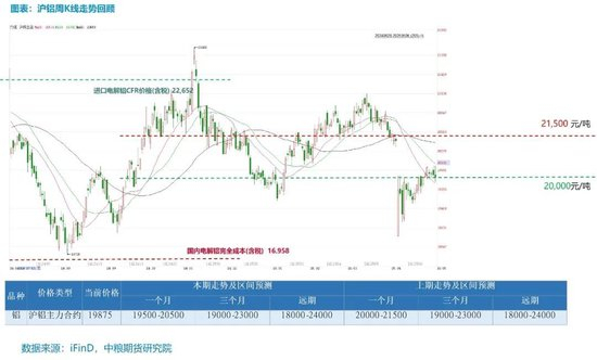 短期来看,枯水期即将结束,叠加电解铝冶炼高利润,预计电解铝供应将维持高位;内需政策利好可期,抵消外需不佳,电解铝价格区间预计为【19500,21500】元/吨。