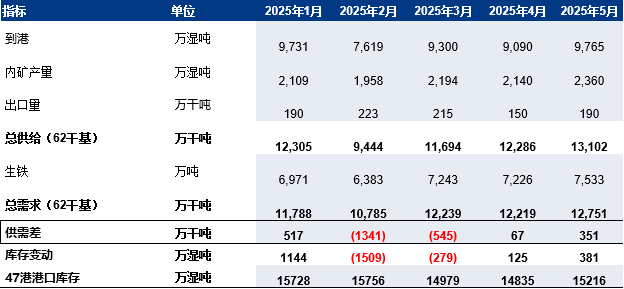 月度平衡表:Mysteel铁矿石分析团队4月30日预计,5月份中国铁矿石市场供大于求,47港铁矿石库存小幅累库。