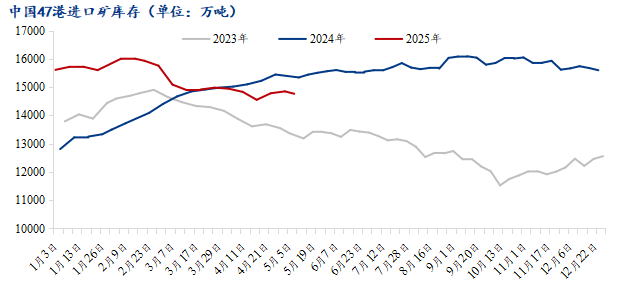 下期从卸货端考虑,到港小幅回落;从需求端考虑,目前铁水维持高位,日均疏港量小幅回落,下周预计整体卸货入库量或将低于出库量。综合预测,下期47港港口库存或将小幅去库。