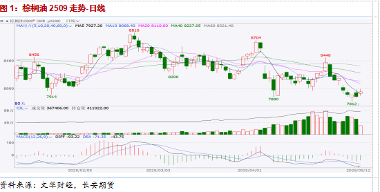 上周是五一假期后收假的第一周,国内油脂板块走势有所分化,豆油、菜籽油在前期震荡区间内延续震荡运行,而棕榈油出现了明显的下跌态势。棕榈油的下挫一定程度上是受到了国际油价的拖累,但在周中原油企稳之后,我们发现棕榈油依然延续弱势,核心还是在于产地供需基本面的偏弱格局所致。截至2025年5月9日,棕榈油主力合约周线收跌幅度最大,为3.22%;菜籽油主力合约周线收涨0.62%;豆油主力合约周线收跌0.66%。