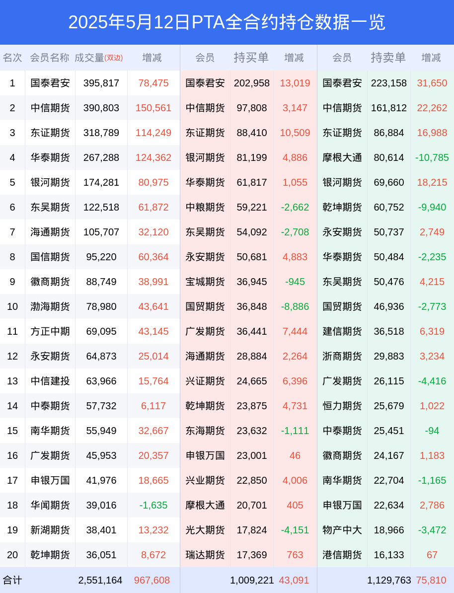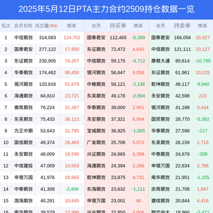 新浪期货 根据交易所数据,截至5月12日收盘主力合约PTA2509,涨跌+3.11%,成交量139.12万手,持仓数据显示前20席位呈现净空,差额头寸为77691手。