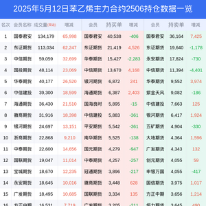 新浪期货 根据交易所数据,截至5月12日收盘主力合约苯乙烯2506,涨跌+4.89%,成交量55.54万手,持仓数据显示前20席位呈现净空,差额头寸为777手。