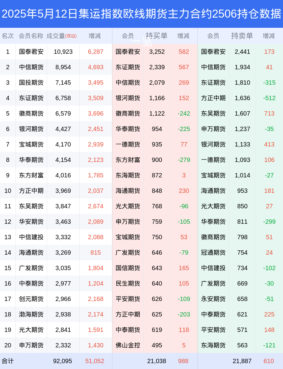 新浪期货 根据交易所数据,截至5月12日收盘主力合约集运指数欧线期货2506,涨跌+16.00%,成交量8.20万手,持仓数据显示前20席位呈现净空,差额头寸为849手。