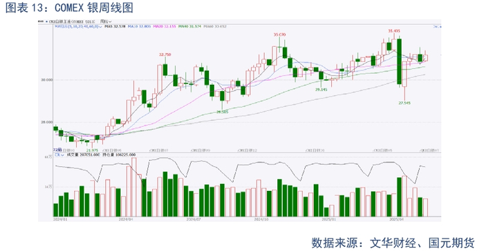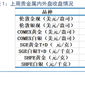 上周白银价格高位震荡,COMEX白银期货上涨2.18%。美国4月ISM服务业PMI指数为51.6,好于预期。欧盟与美国上个月正式启动的谈判进展甚微,如果谈判失败,欧盟计划对价值1000亿欧元的美国商品加征关税。国内一揽子金融政策支持稳市场稳预期,总量性与结构性政策并举,缓和市场阶段性压力。英国和美国就关税贸易协议条款达成一致,但细节尚待敲定。地缘政治方面,印巴冲突升级。关税谈判取得进展,全球贸易紧张局势缓和,白银高位盘整。后续或维持震荡走势。