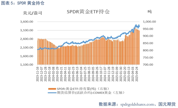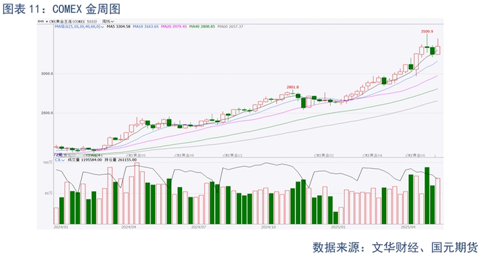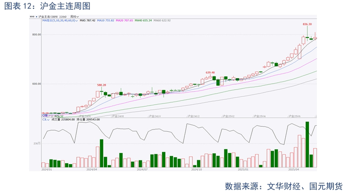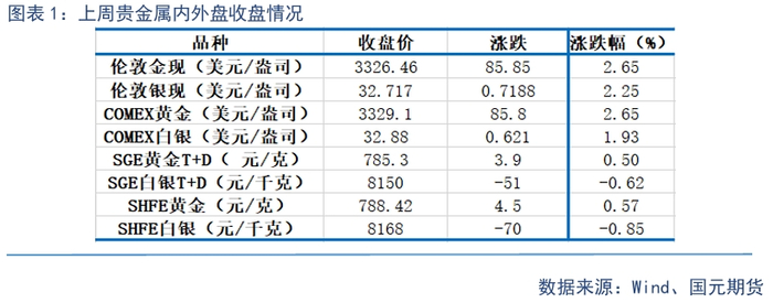 上周黄金价格高位震荡,COMEX黄金期货上涨2.52%,周内最高涨至3448.2美元/盎司。美国4月ISM服务业PMI指数为51.6,好于预期。欧盟与美国上个月正式启动的谈判进展甚微,如果谈判失败,欧盟计划对价值1000亿欧元的美国商品加征关税。国内一揽子金融政策支持稳市场稳预期,总量性与结构性政策并举,缓和市场阶段性压力。英国和美国就关税贸易协议条款达成一致,但细节尚待敲定。地缘政治方面,印巴冲突升级。关税谈判取得进展,全球贸易紧张局势缓和,黄金高位盘整。后续或维持震荡走势。
