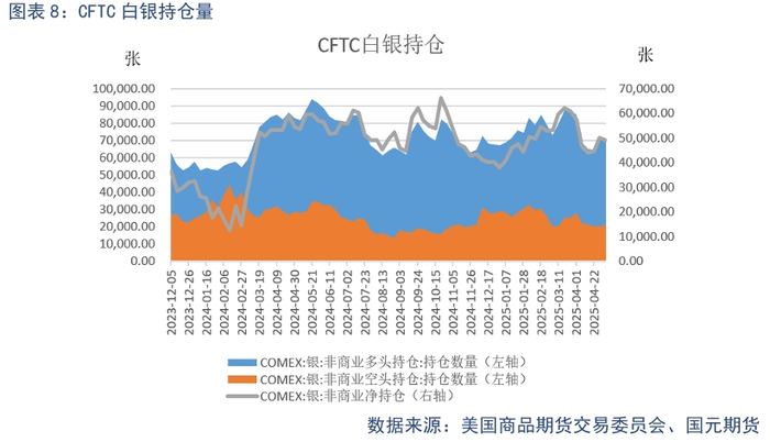 截止5月6日的周度统计周期中,黄金非商业多头持仓为237445张,较上周减少2932张,非商业空头持仓为74948张,较上周减少2111张,基金净持仓减少821张,多头离场,空头离场,多头持仓变化更大。截止5月6日的周度统计周期中,白银非商业多头持仓为70335张,较上周增加36张,非商业空头持仓为21083张,较上周增加727张,基金净持仓减少691张,多头进场,空头进场,空头持仓变化更大。