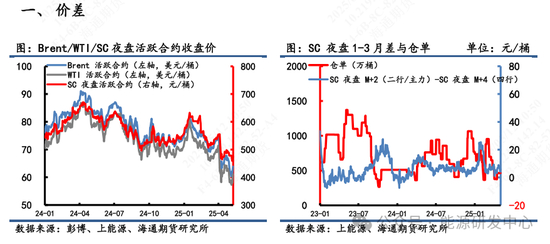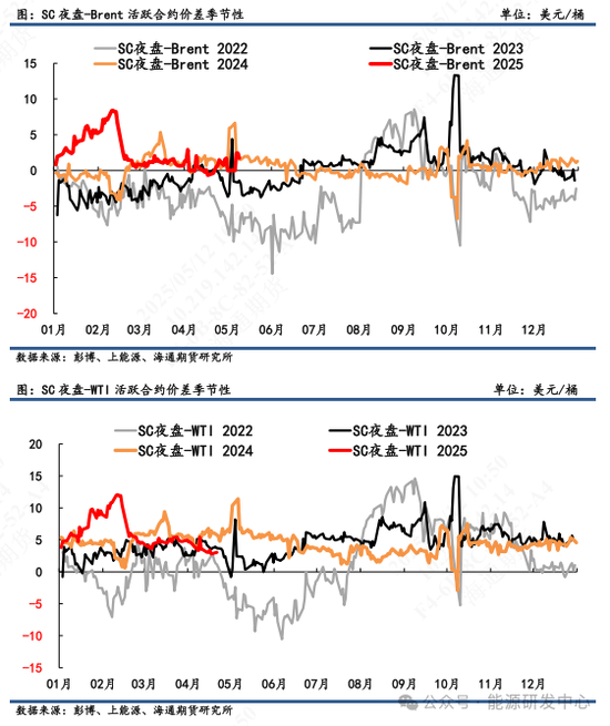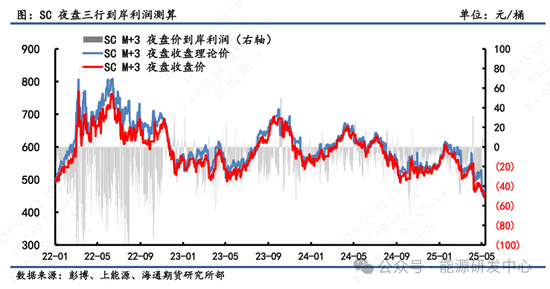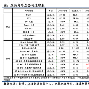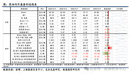 2)套利:①估值:5月9日凌晨2:30,Brent 2507盘面价为62.89美元/桶,SC 2508盘面价为456.7元/桶,测算SC 2508盘面理论价为472.2元/桶,盘面估值偏离程度-3.29%。②利润:测算SC2508盘面到岸利润-15.54元/桶,折合-2.15美元/桶。③价差:SC2508-Brent2507盘面差为0.19美元/桶,理论差2.33美元/桶,盘面价差低于理论价差。(注:本周Brent首行为2507;SC首行为2506;其中M代表时下5月)